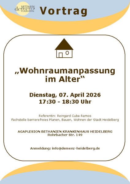 Das Netzwerk Demenz Heidelberg lädt zu einem informativen Vortrag rund um das Thema „Wohnraumanpassung im Alter“ ein. Im Mittelpunkt steht die Frage, wie Wohnräume so gestaltet werden können, dass sie Sicherheit, Selbstständigkeit und Lebensqualität im höheren Lebensalter bestmöglich unterstützen.