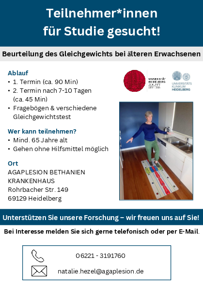 Unterstützen Sie unsere Forschung - wir freuen uns auf Ihre Teilnahme! In dieser Studie befassen wir uns mit der Beurteilung des Gleichgewichts bei älteren Erwachsenen. Ziel ist es, besser zu verstehen, wie Balance im Alltag funktioniert und wie man sie stärken kann. Ihre Mitwirkung trägt dazu bei, Präventions- und Behandlungsansätze zu verbessern.